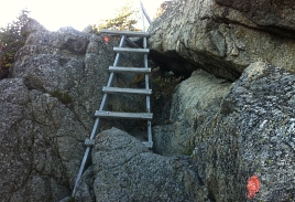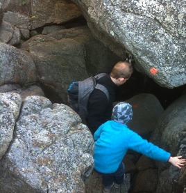 Vägen till grottorna på Smitingens vänstra sida är en promenad genom ett omväxlande landskap. Vi lämnar sandstranden med sina eviga vågor och kommer in i skogen vid Klubbsjön. Sedan blir det brant uppför. Vid svårare passager finns rep, små träbroar eller stegar. Klippblock och glesa tallar kantar vår väg. Barnen springer före och spanar efter färgprickarna som visar vägen.