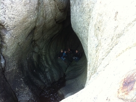 Efter skogspromenaden står vi plötsligt vid havet igen, högt uppe med en fantastisk utsikt. Stigen går ned till vattenbrynet. Det blir klättring nedför en trästege och passage under ett stort klippblock för att komma till den största grottans ingång. Det krävs ett visst mod och skor som har bra fäste för att ta sig ända in. även de största vågorna tar sig in och det är en aning halt. Tunnelgrottorna är vackert utsvarvade. Vågorna har eroderat fram de lökformade öppningarna som sedan landhöjningen flyttat upp på torra land.