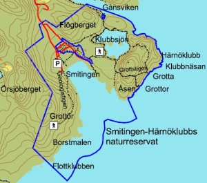 På Härnöns östra sida, inte långt från centrala Härnösand ligger det vackra havsbadet Smitingen. Till Smitingen är det skyltat från E4 i centrala Härnösand. Tag vägen mot Specksta och Gånsvik. Strax innan Gånsvik tar du av till Smitingens havsbad. Från serveringen på Smitingen utgår de markerade stigarna med vägvisare. Tips: välj skor med bra gummisulor om du vill gå till grottorna eller följa geologistigarna.